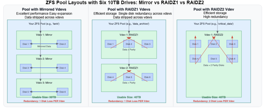 - Si pones todos tus discos en un vdev RAIDZ2 grande, puedes perder dos discos sin perder datos. Sin embargo, la expansión significa agregar otro vdev completo.