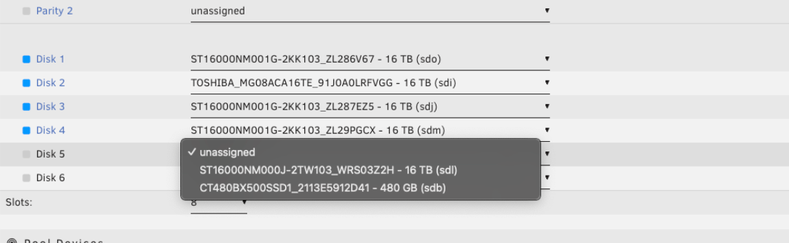 - Haga clic en una ranura vacía bajo Dispositivos del Array.
